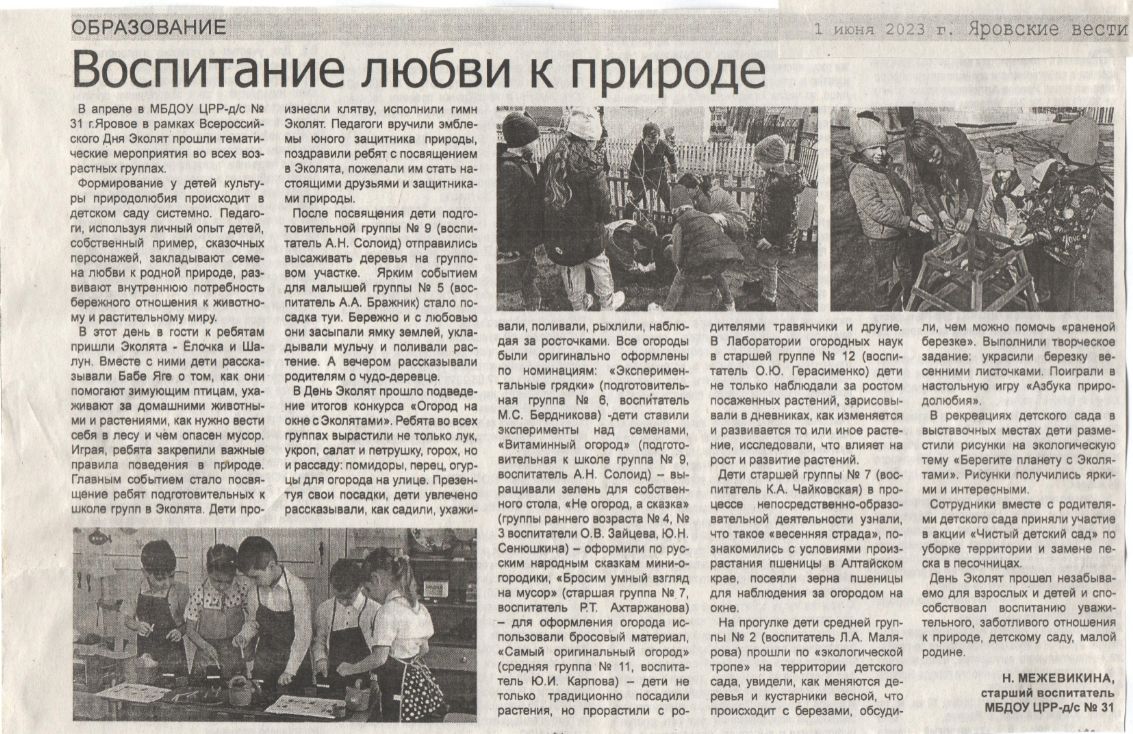 В День Эколят прошло подведение итогов конкурса «Огород на окне с Эколятами». Ребята во всех группах вырастили не только лук, укроп, салат и петрушку, горох, но и рассаду: помидоры, перец, огурцы для огорода на улице. Презентуя свои посадки, дети увлечено рассказывали, как садили, ухаживали, поливали, рыхлили, наблюдая за росточками. Все огороды были оригинально оформлены по номинациям: «Экспериментальные грядки» (подготовительная группа № 6, воспитатель Бердникова М.С.) -дети ставили эксперименты над семенами, «Витаминный огород» (подготовительная к школе группа № 9, воспитатель Солоид А.Н.) – выращивали зелень для собственного стола, «Не огород, а сказка» (группы раннего возраста № 4, № 3 воспитатели Зайцева О.В., Сенюшкина Ю.Н.) – оформили по русским народным сказкам мини-огородики, «Бросим умный взгляд на мусор» (старшая группа № 7, воспитатели Ахтаржанова Р.Т., Чайковская К.А.) – для оформления огорода использовали бросовый материал, «Самый оригинальный огород» (средняя группа № 11, воспитатели Карпова Ю.И., Чуваткина С.М.) – дети не только традиционно посадили растения, но прорастили с родителями травянчики, эстетичный "Огород с Эколятами" оформили на группе №2 (воспитатель Малярова Л.А.). В Лаборатории огородных наук в старшей группе № 12 (воспитатель Герасименко О.Ю.) дети не только наблюдали за ростом посаженных растений, зарисовывали в дневниках, как изменяется и развивается то или иное растение, исследовали, что влияет на рост и развитие растений. 1 место среди младших групп занял огород на окне в группе №5 (воспитатель Бражник А.А.), среди старших групп - огород группы № 12 (воспитатель Герасименко О.Ю.).