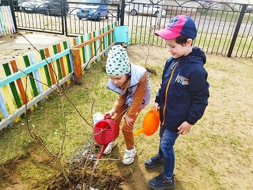 После посвящения дети подготовительной группы № 9 (воспитатель Солоид А.Н.) отправились высаживать деревья на групповом участке. Ярким событием для малышей группы № 5 (воспитатель Бражник А.А.) стало посадка туи. Бережно и с любовью они засыпали ямку землей, укладывали мульчу и поливали растение. А вечером рассказывали родителям о чудо-деревце.